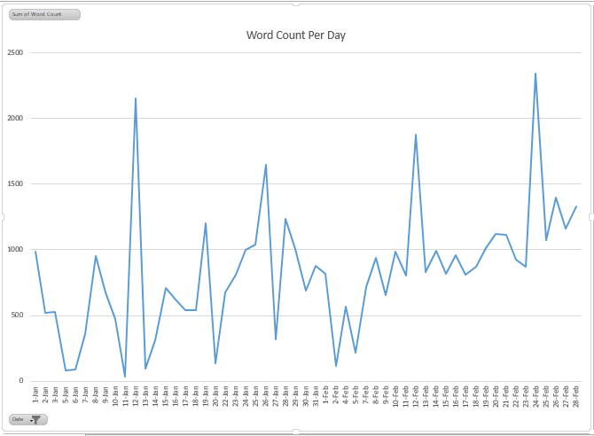 Getting up to over 1000 words a day by the end of February: DONE. The last 5 days were each over 1,000 words with 9 days total hitting that mark in February.