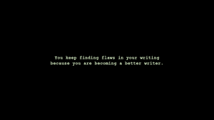 I’ve blogged about it before, I think on my old site before it had crashed. A friend had sent me a background for my desktop some time ago. A simple background, black with the words, “You keep finding flaws in your writing because you are becoming a better writer.” (For the record, I don’t know who the originator of it is… it certainly isn’t me.)