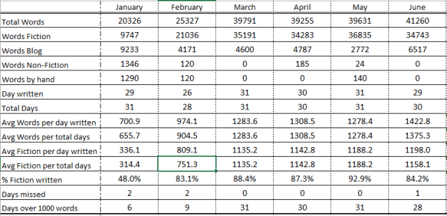 As you can see, my total word count was the highest so far this year at 41,260 words. That’s with missing a day too. That’s writing two less days than in May.